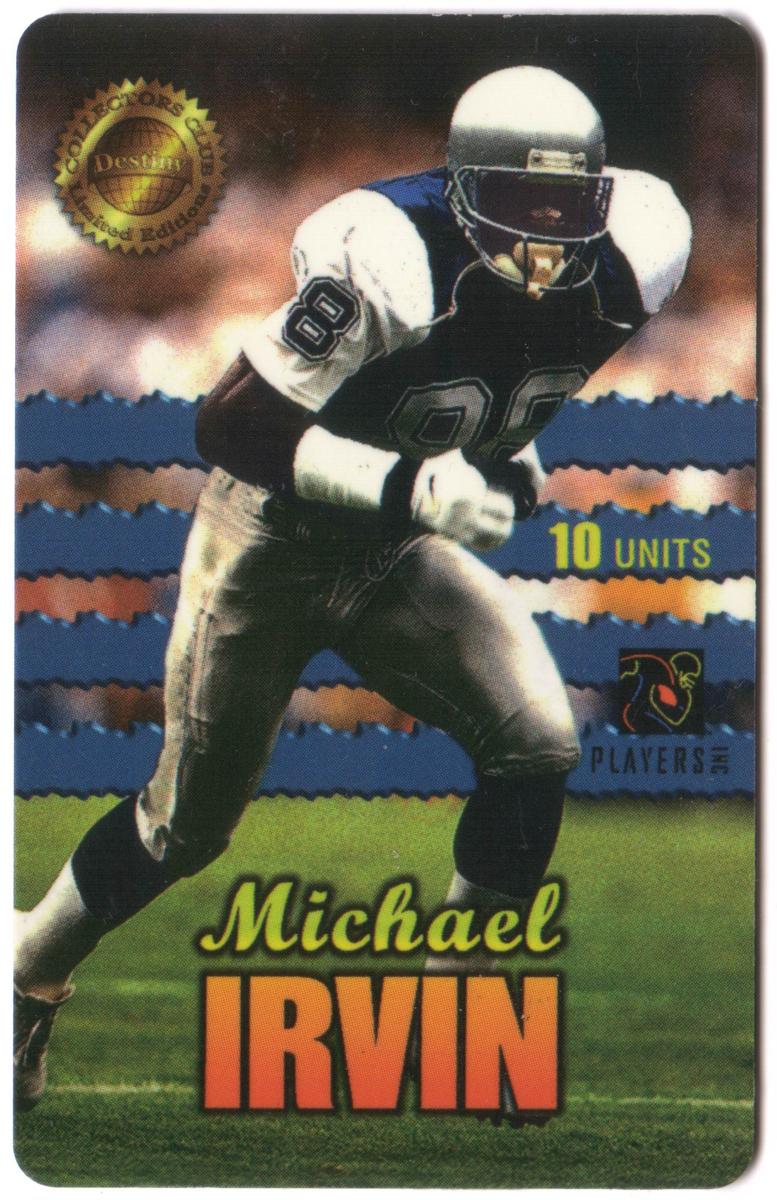 This card is number 25 out of a limited edition of 100 produced. It includes a football-themed motif prominently featuring football imagery consistent with the sport. The card has the “Destiny Telecomm” branding, indicating its connection to the Destiny collectible series. The text on the card clearly states Michael Irvin's name, position as a wide receiver (WR), and affiliation with the Dallas Cowboys.