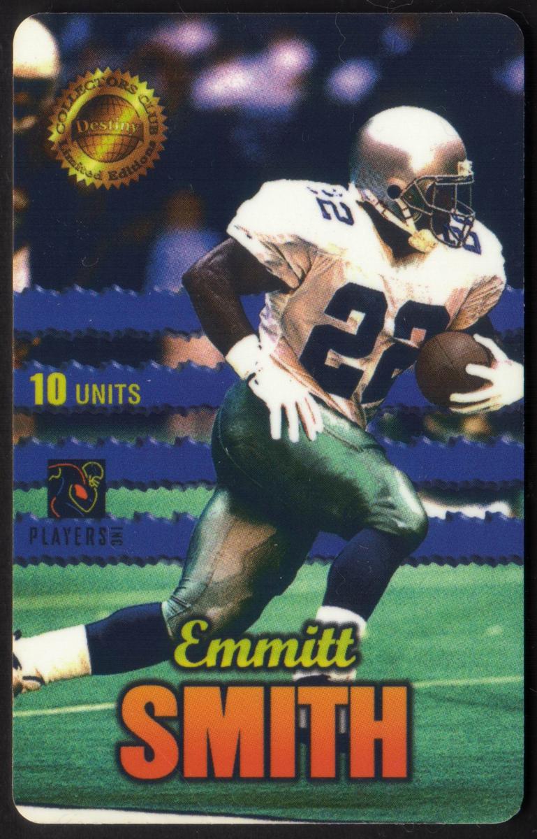 The card bears the "Destiny Telecomm" branding, associating it with a collectible series centered on football players and the NFL. The design highlights a strong football theme, emphasizing Emmitt Smith’s status in professional football history, particularly within the Dallas Cowboys franchise. The imagery and text on the card confirm its authenticity as a sports collectible.