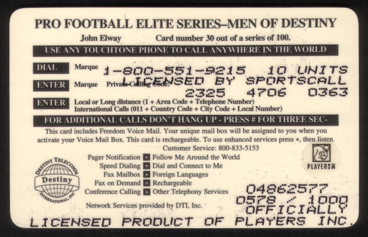 This is card number 30 out of a limited edition run of 100, part of the "Men of Destiny" series focusing on notable football players in the NFL. The combination of photographic imagery, player name, and limited edition marking highlights this as a collectible phone card related to American football history and the National Football League.