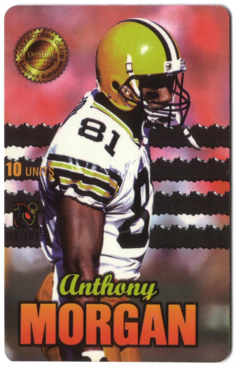 In addition to the athlete’s image and name, the card shows footballs and other visual motifs that enhance the football theme. The Green Bay Packers’ team colors and logos are also prominent, providing context about the player’s affiliation. All information is presented clearly on the card front, establishing it as a collectible phone card centered on Anthony Morgan’s career with the Green Bay Packers.