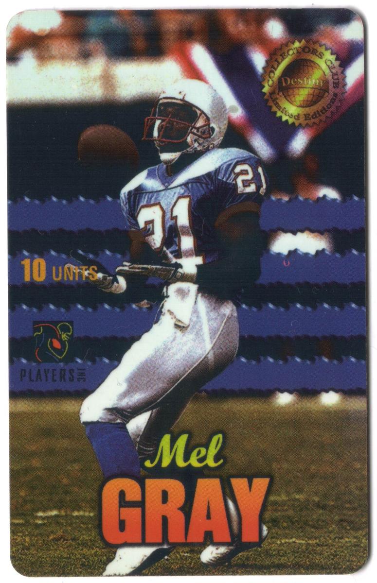 The card includes multiple football-related icons such as footballs and official NFL motifs, emphasizing its connection to the sport. Additional text on the card notes "Destiny Telecomm," linking the collectible to this specific brand or series. The card has a used status and is designated with "Mel Grey 10u," linking it specifically to Mel Gray in this collectible series. This item is a football collectible that highlights an NFL player’s profile and memorabilia status.