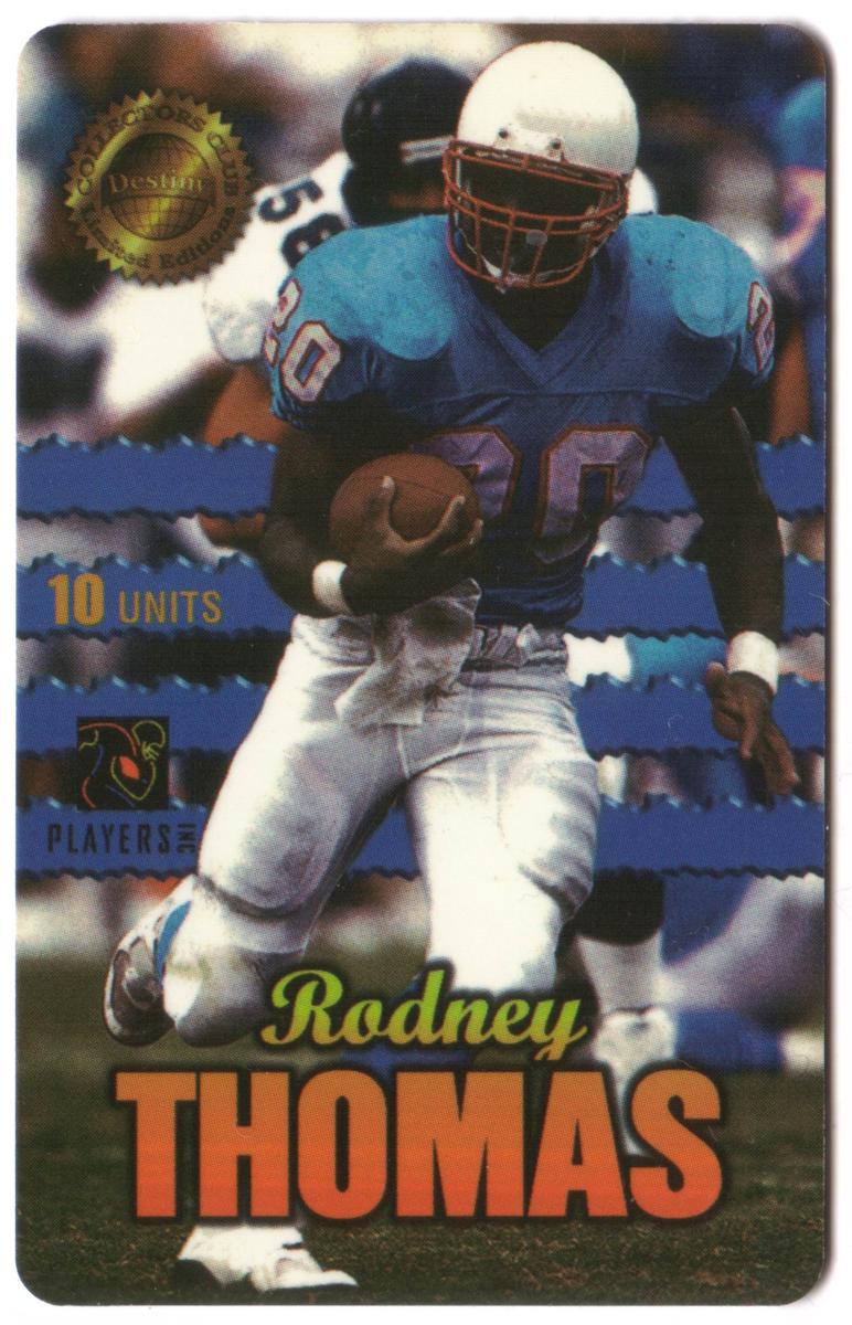 This collectible card features Rodney Thomas, a running back (RB) for the Houston football team, identified as card number 41 of 100. The card is titled "Men of Destiny" and is part of the Destiny Telecomm series. It highlights Rodney Thomas in football gear, emphasizing his role and identity within the National Football League (NFL).