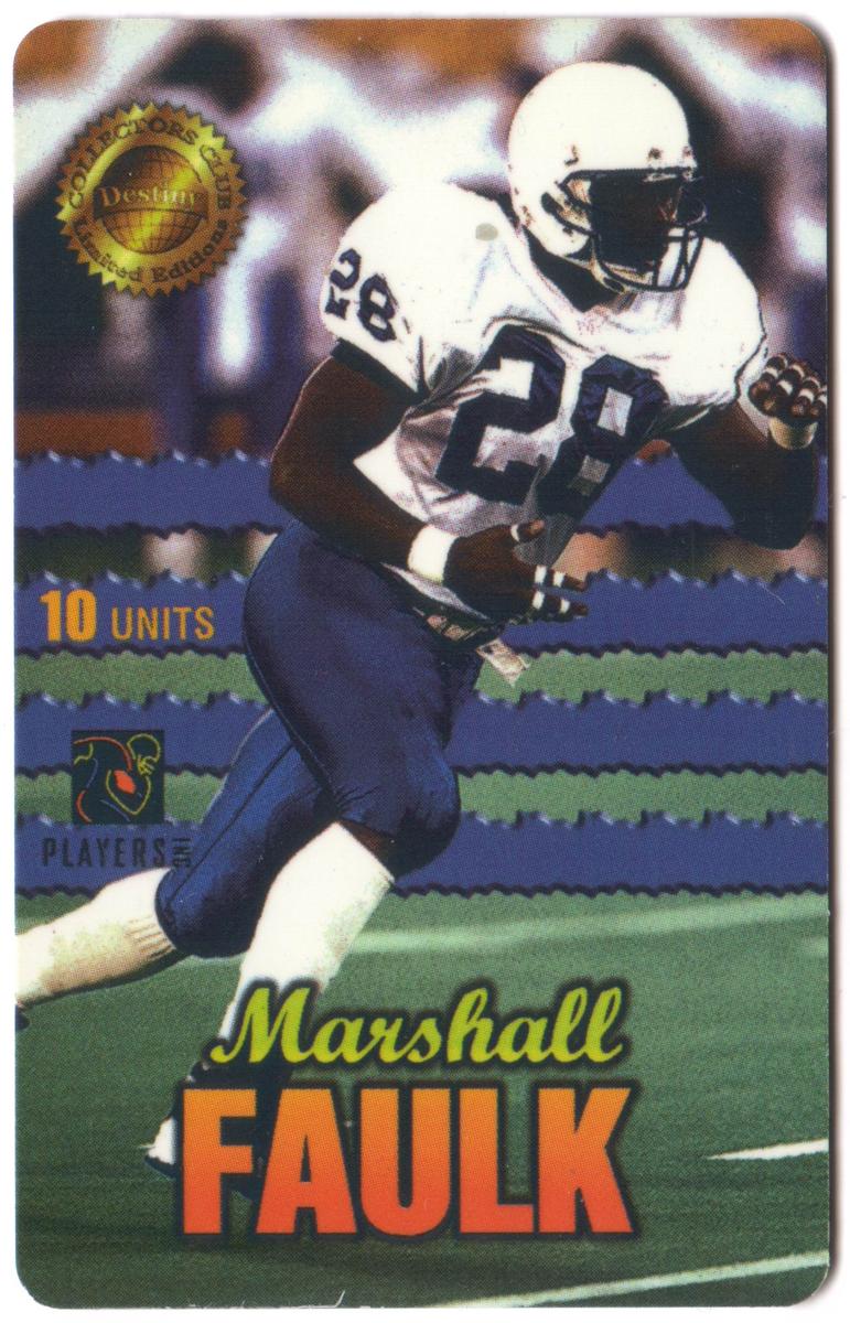 Limited-edition Marshall Faulk phone card featuring dynamic action, vibrant colors, and authentic collector''s details for NFL fans and memorabilia collectors.
