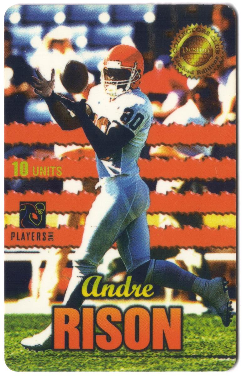 This collectible phone card features a photographic image of Andre Rison, a wide receiver for the Jacksonville Jaguars in the National Football League (NFL). Andre Rison is shown wearing his football uniform, including a helmet and jersey, as he prepares to catch a football during a game. The action shot captures the intensity and focus of the player in mid-play, highlighting his athletic stance and the detailed textures of his football gear.