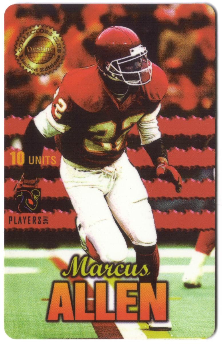 The card is part of a product line named "Destiny Telecomm" and is marked as "Used," indicating it has been previously circulated or registered. The overall presentation celebrates Marcus Allen’s career within the NFL and highlights the collectible nature of this football player card in a limited numbered series.