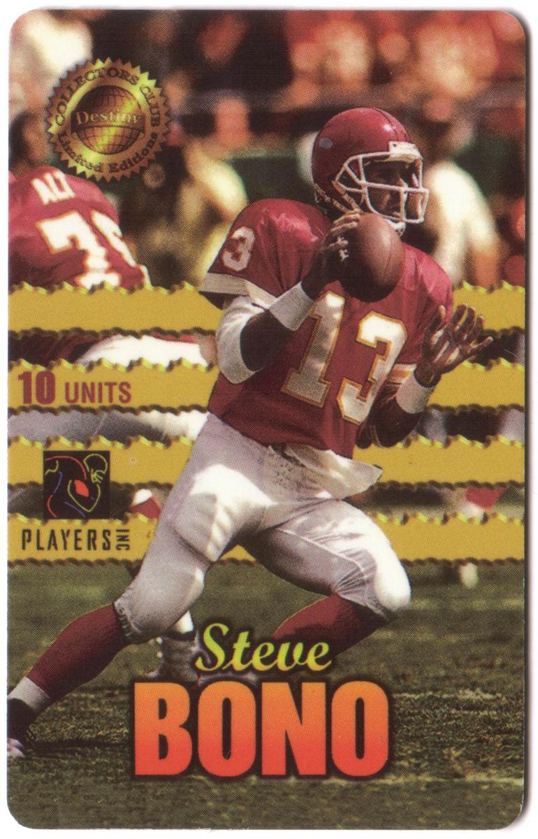 Overall, the card celebrates Steve Bono’s career in professional football with a clear focus on his role as a Kansas City Chiefs quarterback. It combines photographic and graphic elements centered on American football and the NFL, making it a collectible item for football fans and sports memorabilia collectors.