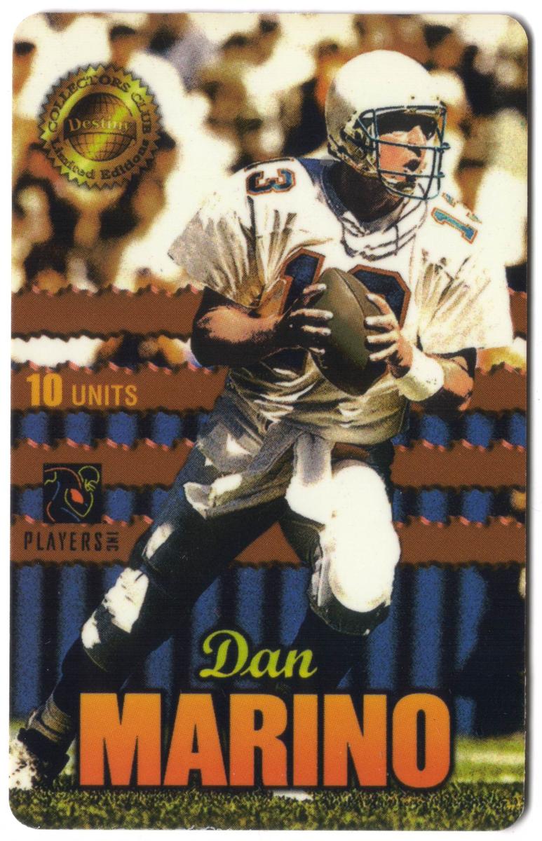 This collectible card features Dan Marino, the legendary quarterback of the Miami Dolphins, prominently displayed in full football gear. Marino is shown in action, preparing to throw a football. He wears the Dolphins’ traditional white jersey with aqua and orange accents, and matching white pants. The background includes a football field and stadium setting, emphasizing the NFL and National Football League context of the card.