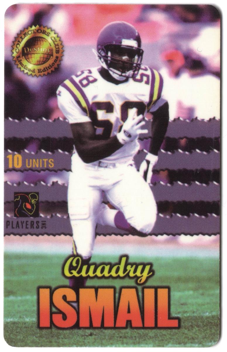 This collectible card features Quadry Ismail, a wide receiver (WR) for the Minnesota football team. The card is marked as number 55 out of a limited run of 100 and is from a series titled "Men of Destiny 10u." It is associated with the National Football League (NFL) and includes imagery related to football, highlighting the sport’s theme clearly. The card bears the Destiny Telecomm logo, indicating it is connected to Destiny Telecomm.