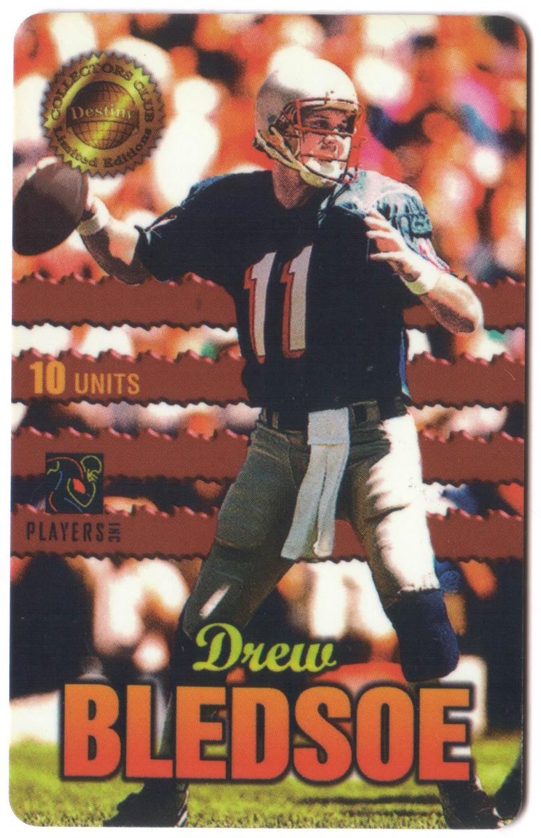 The card’s overall aesthetic incorporates the colors and style related to the New England Patriots team, with clear emphasis on Drew Bledsoe’s role as quarterback. The combination of player imagery and branding elements clearly identifies this as a collectible football card within the NFL memorabilia category.