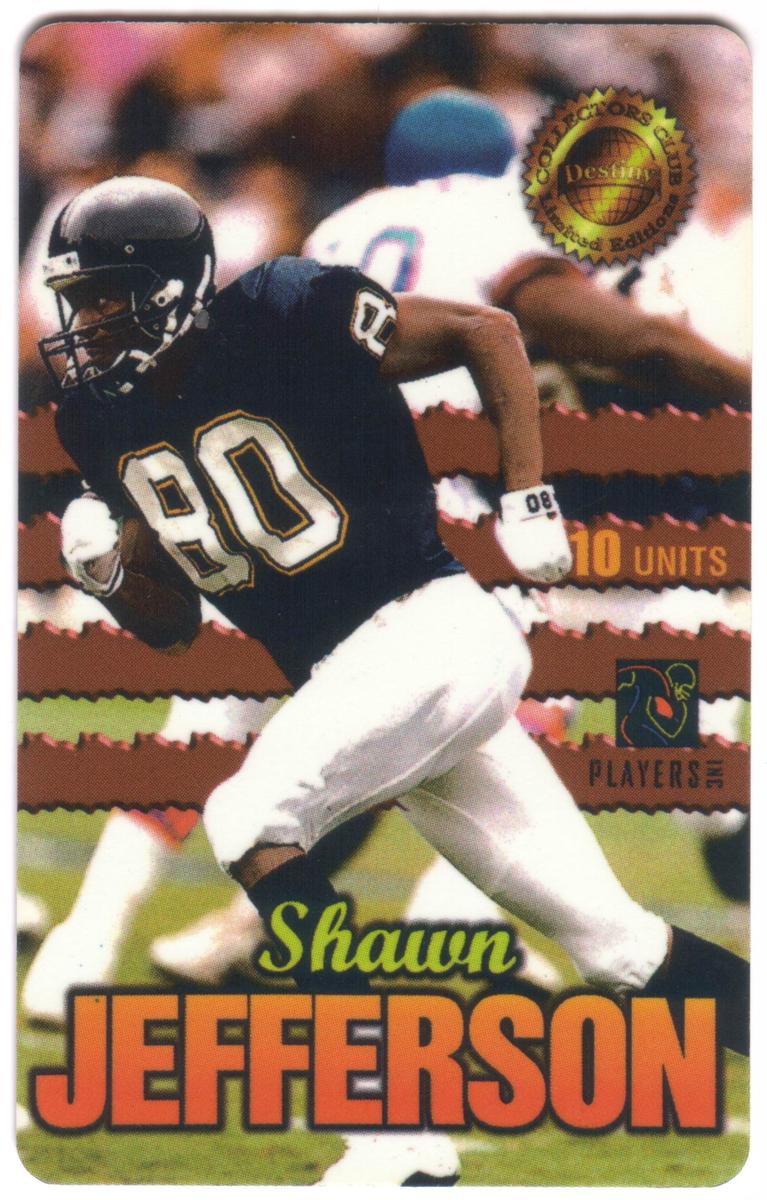 Overall, the card combines official football elements with the portrait and identification of Shawn Jefferson, making it a distinctive collectible for fans of NFL football and memorabilia collectors, especially those focused on player cards from the Destiny Telecomm series.