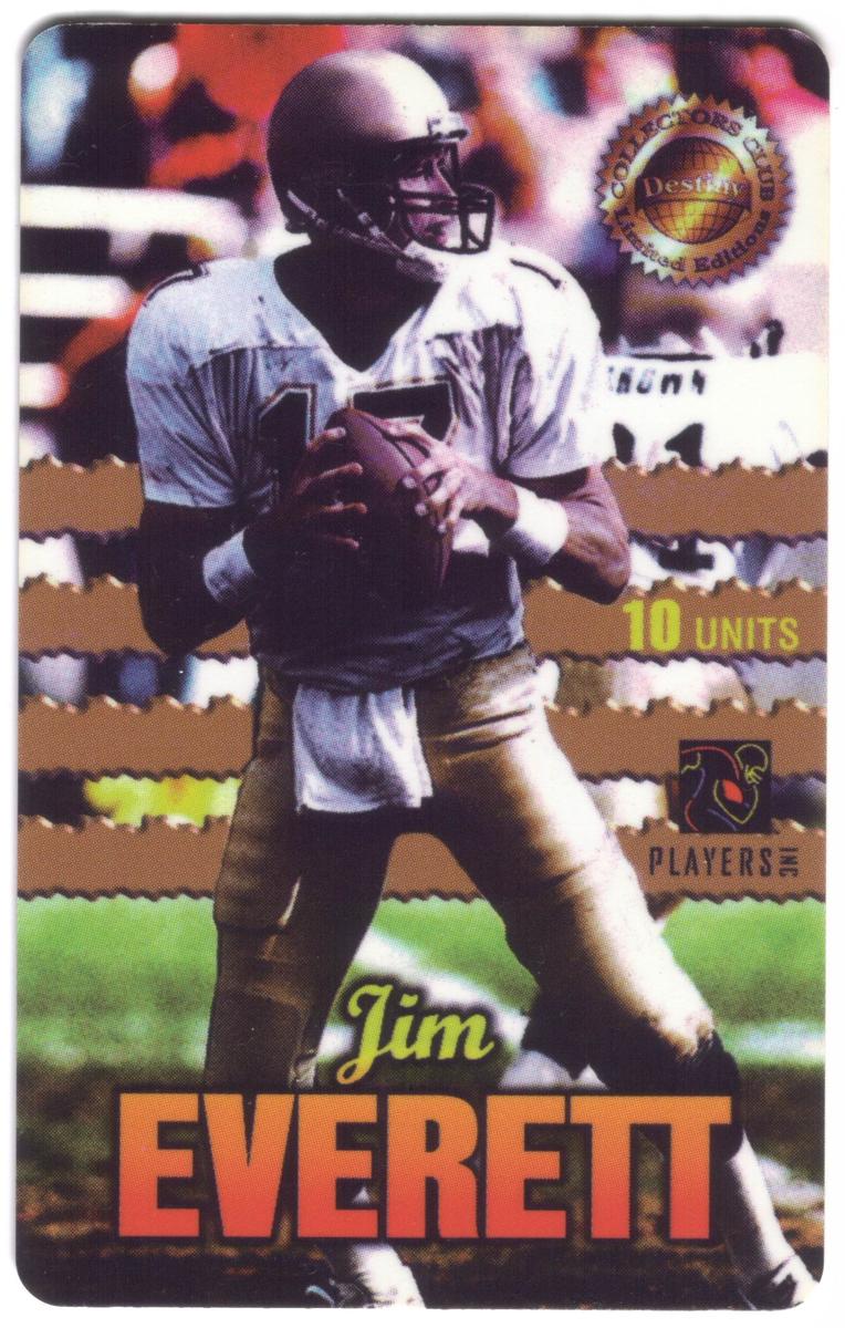 Overall, this card commemorates Jim Everett as a notable NFL quarterback for the New Orleans Saints, capturing his athletic presence with a focus on football action. It belongs to a small, numbered set of 100 cards that celebrate football players in the "Men of Destiny" theme.