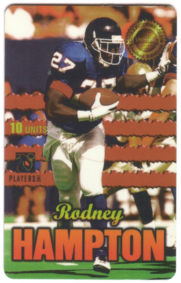 The card is issued by Destiny Telecomm and is marked as a used item. Prominent elements include the New York Giants logo and NFL branding. The design focuses on the sport of football, featuring football imagery, such as footballs integrated into the layout. Rodney Hampton’s name and team affiliation are clearly printed on the card.