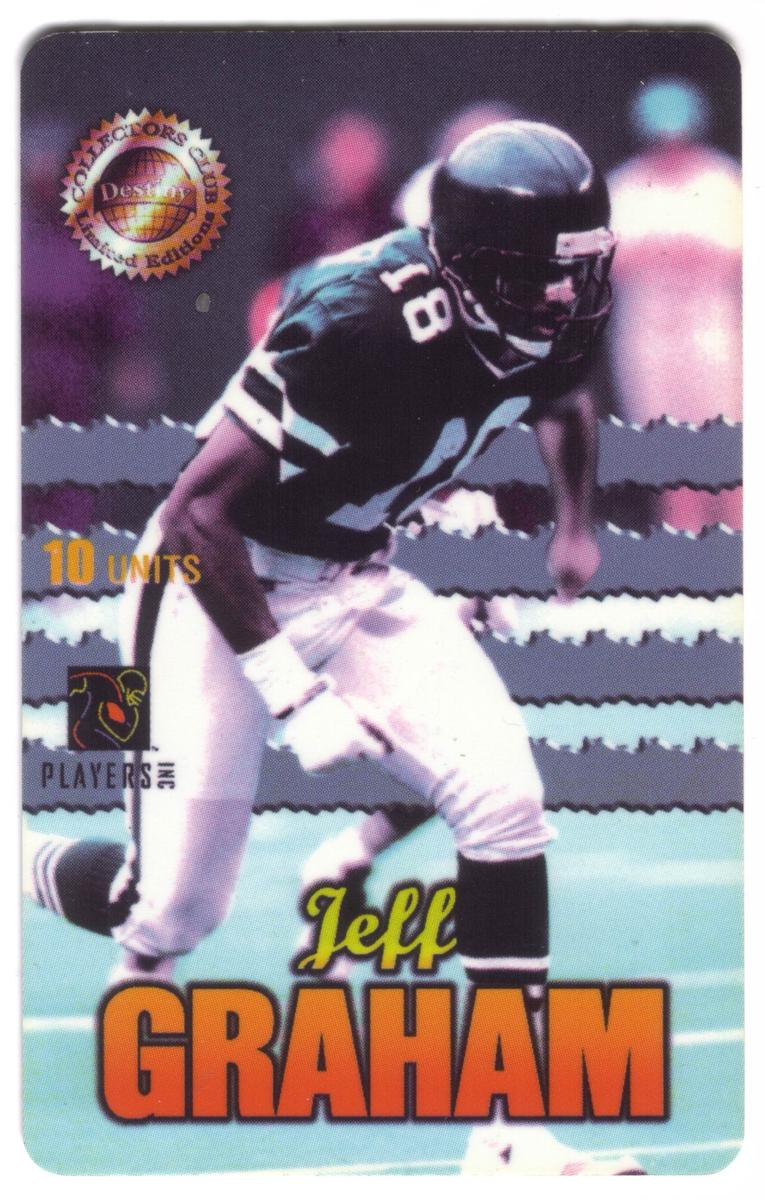 The card is issued by Destiny Telecomm and is identified as "Used." It has a football motif, with the image and text centrally focused on Jeff Graham’s role and team. "WR NY Jets" denotes his position and team. The set it belongs to relates to football players in the National Football League, capturing notable athletes in collectible form.