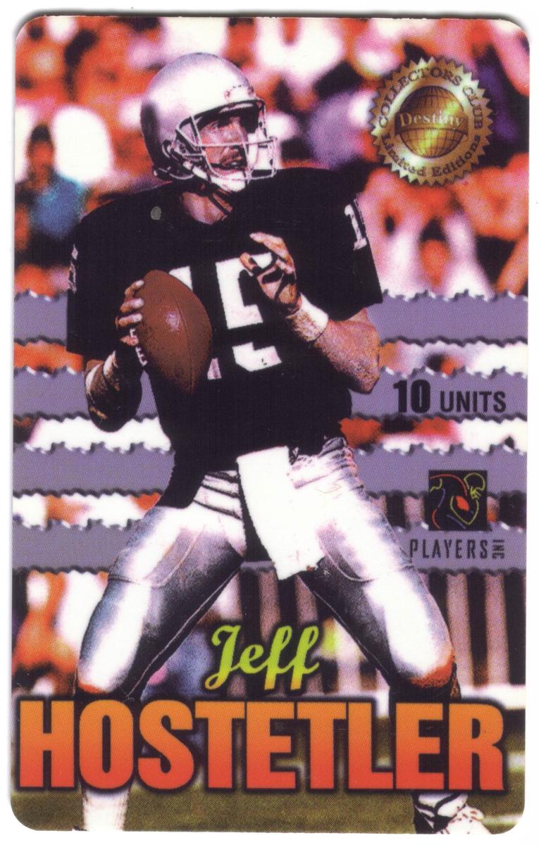 The card displays the words "Destiny Telecomm" along the bottom, signifying the issuing company. The design includes an image of a football and a field background that emphasizes its connection to the sport of American football. Text on the card includes Jeff Hostetler’s name and position ("QB"), along with the team name "Oakland," referring to the Raiders franchise.