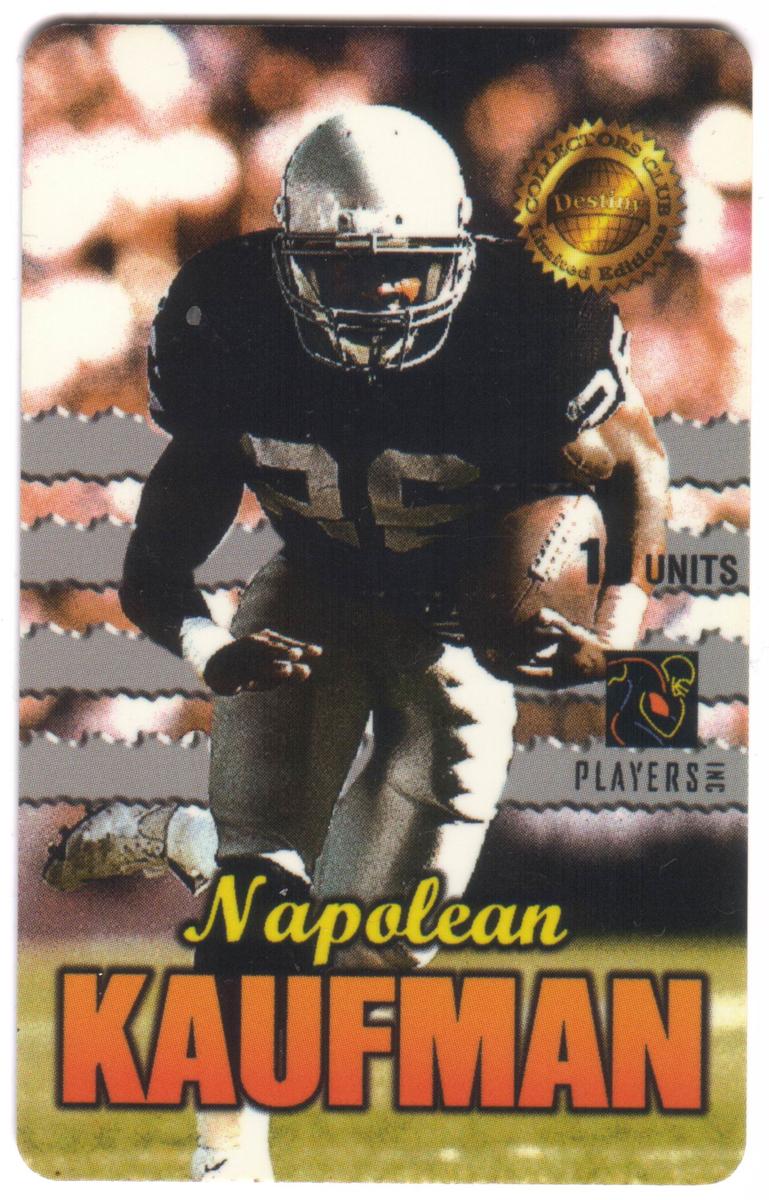The card has "Destiny Telecomm" branding at the bottom, indicating it is related to the Destiny phone card series. The background of the card shows a green football field with markings, with Kaufman in action posed as if carrying or running with the football. His name and position "NAPOLEON KAUFMAN RB OAKLAND" appear in bold lettering along the bottom edge of the card. At the top, the NFL shield logo and the words "National Football League" are displayed prominently, emphasizing the official NFL licensing.