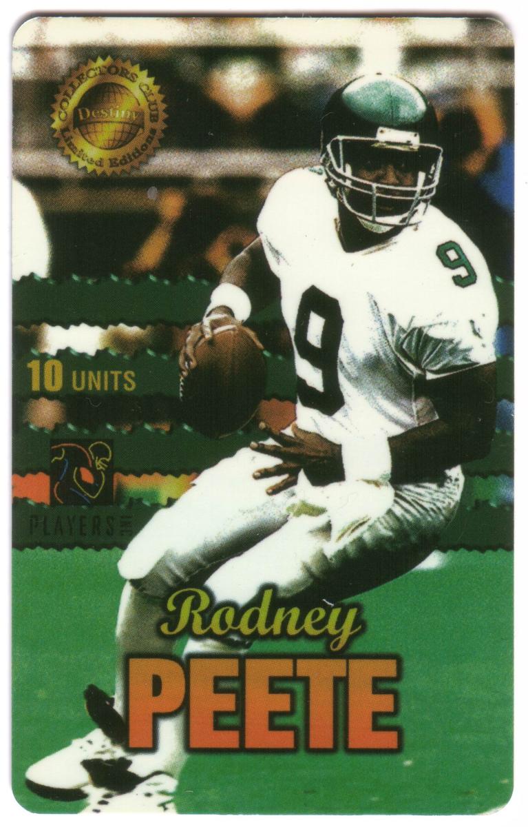 Overall, this card serves as a sports collectible celebrating Rodney Peete's career in the National Football League with the Philadelphia team. It is a numbered, limited edition card from the Destiny Telecomm series, designed specifically for fans of football and NFL collectibles.