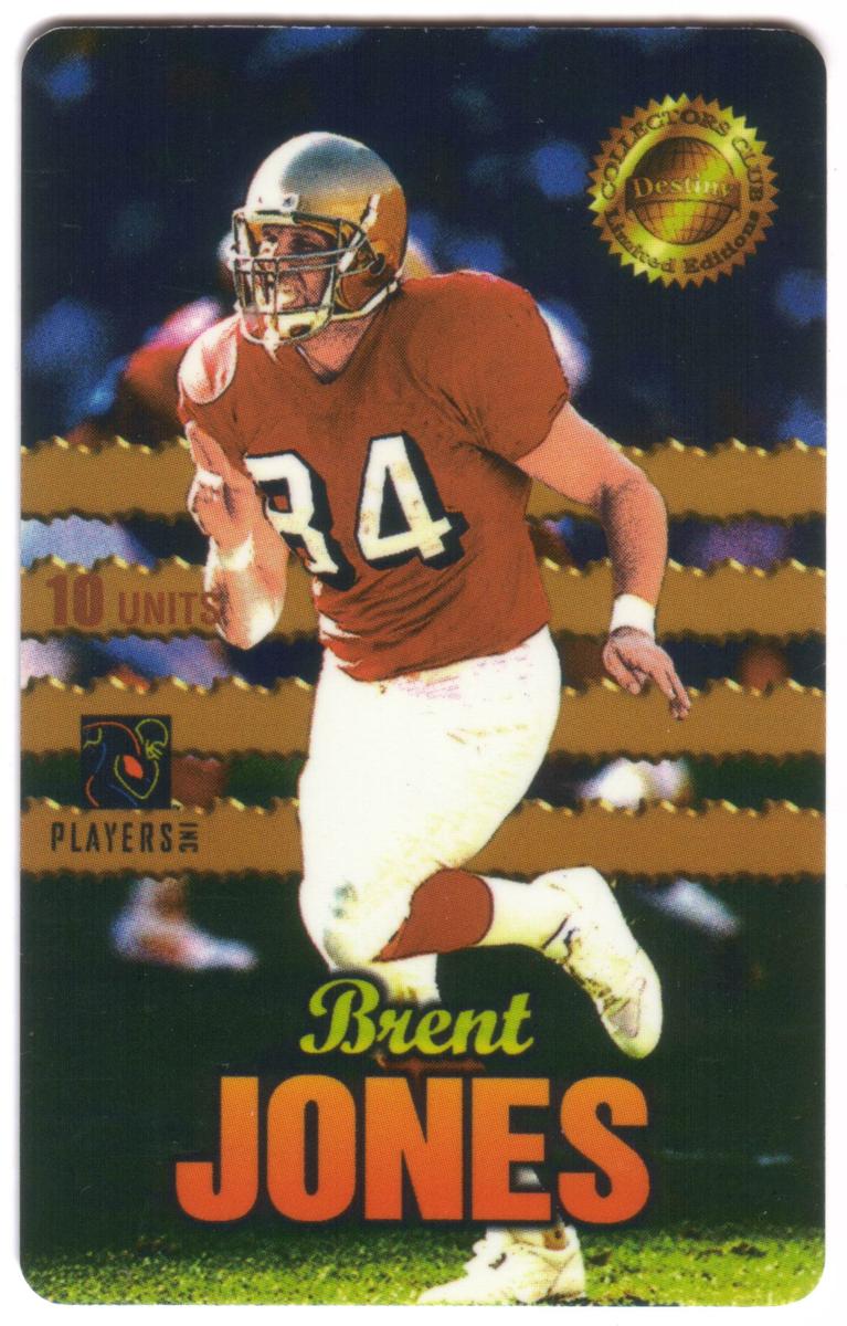 The card includes imagery of footballs, reinforcing its theme centered around the sport of football and NFL athletes. The text on the card mentions "Used - Destiny Telecomm," which connects it to the Destiny Telecomm collection. The NFL and National Football League references establish the card's official association with professional football. The overall design highlights Brent Jones in action or posed, serving as a collectible item for fans of football memorabilia and NFL trading cards.
