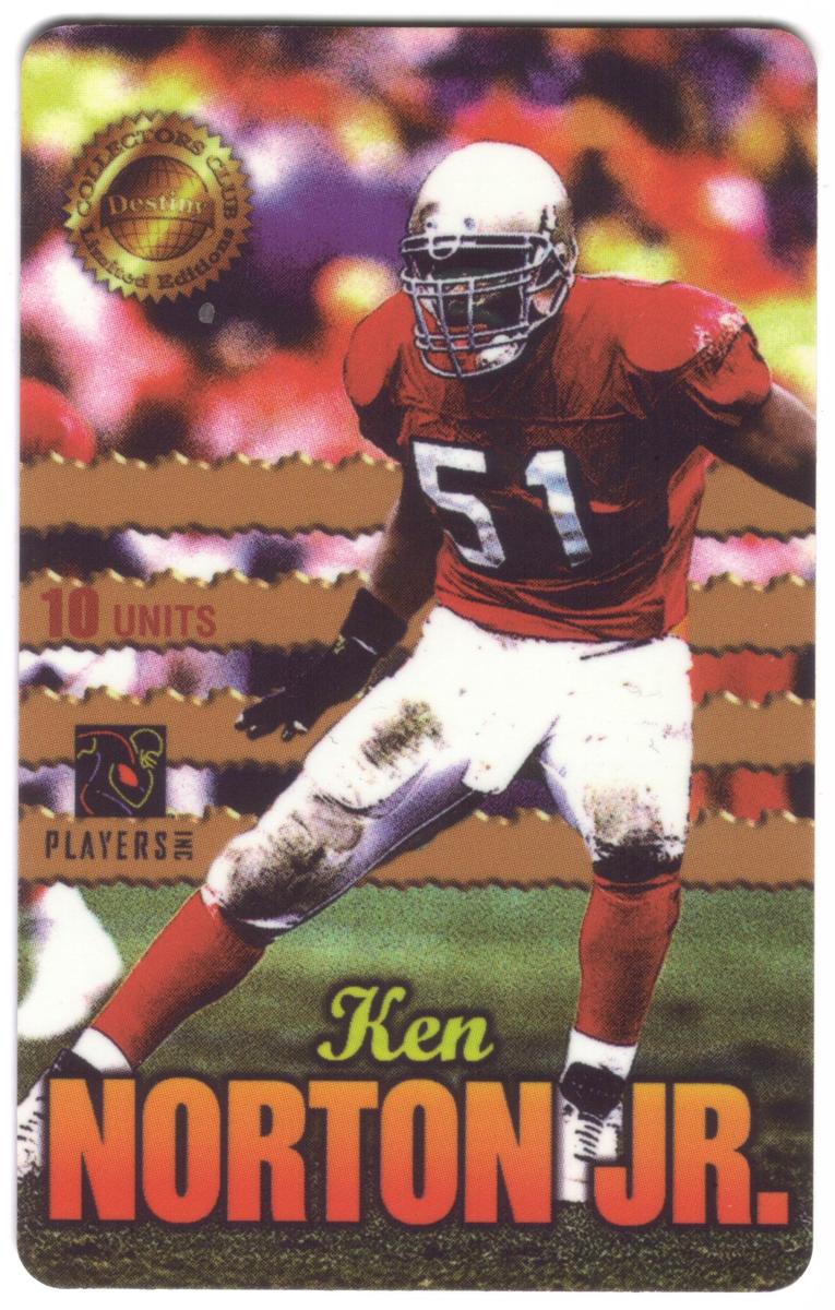 This collectible card features Ken Norton, Jr., a linebacker who played for the San Francisco 49ers in the National Football League (NFL). The card is titled "Men of Destiny" and is part of the 10u football series. It displays a photographic image of Ken Norton, Jr. in his football uniform, wearing the number 87 jersey. The card indicates it is a limited edition, numbered 87 out of 100.