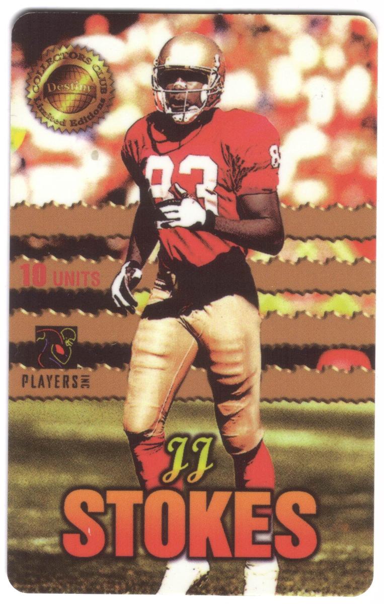 This collectible phone card features J.J. Stokes, a wide receiver (WR) for the San Francisco 49ers of the National Football League (NFL). The card highlights Stokes wearing the team’s red and gold uniform while in a football action pose. His name is prominently displayed as "J.J. Stokes WR San Francisco" with "10u Men of Destiny" also noted, indicating a specific subset or theme within the collectible series.