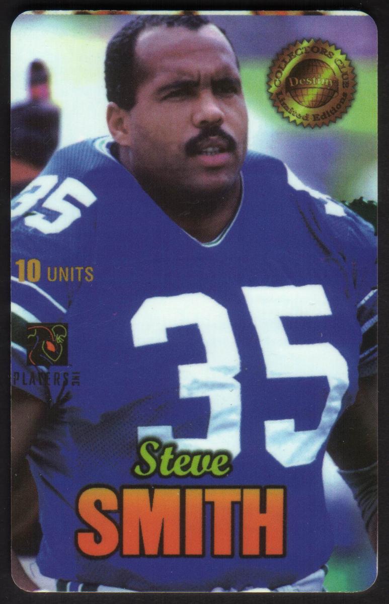 The card belongs to the Destiny Telecomm series and includes the word "USED" printed in bold capital letters, highlighting its collectible status. Steve Smith is shown in action, holding a football as he prepares for a play. The background and layout emphasize the sport of football and the player’s role in it.