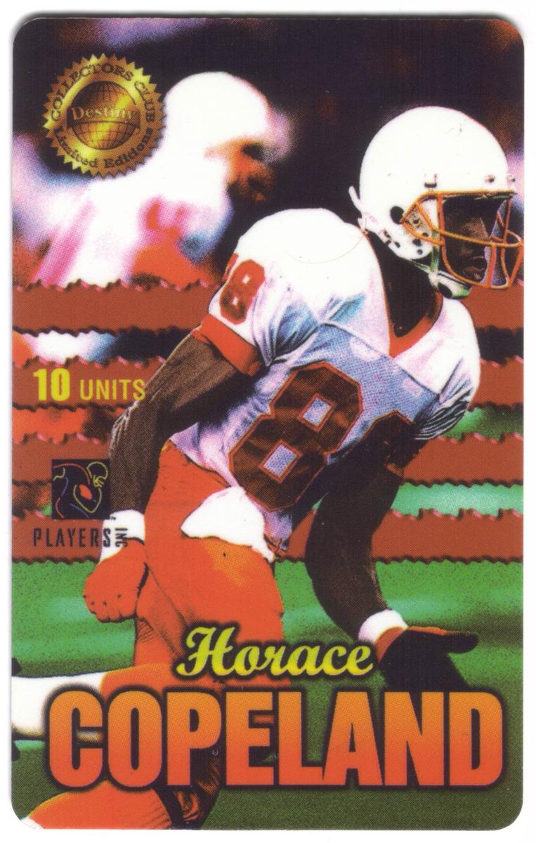 This collectible card features Horace Copeland, a wide receiver (WR) for the Tampa Bay Buccaneers, a team in the National Football League (NFL). The card is titled "10u Men of Destiny" and is numbered 95 out of a limited run of 100. It prominently displays Horace Copeland in football gear, focusing on his role as a professional football player. The card relates to the theme of football and represents an official licensed collectible portraying NFL players.