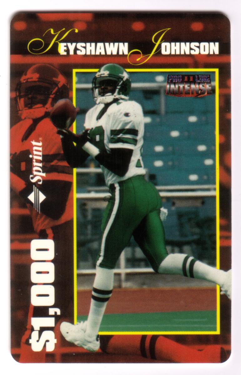 This collectible phone card features Keyshawn Johnson, a professional football player, pictured in his white and green New York Jets uniform mid-action on a football field. The image shows him running while holding a football, preparing to throw. The background includes the green seating area of a stadium under daylight.