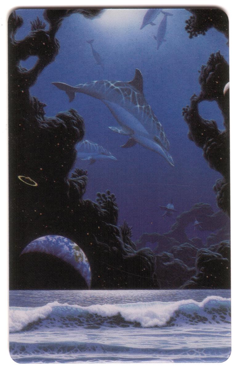 This collectible phone card features an underwater scene with three dolphins swimming gracefully in clear blue water. The artwork captures the fluid motion and natural beauty of these marine mammals as they glide through a vibrant aquatic environment filled with light reflections and subtle hints of underwater flora. The colors predominantly consist of various shades of blue and green, highlighting the depth and clarity of the ocean setting.