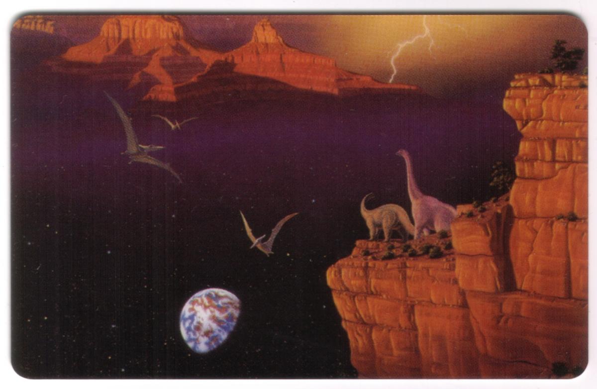 The card is associated with Mercury Marketing and is part of a series that celebrates animals, dinosaurs, prehistoric animals, and extinct reptiles through painted art. It is a collectible item that combines paleontological interest with artistic expression. The artist Schimmel’s signature style is evident in the detailed brushwork and composition, making this a vivid tribute to prehistoric wildlife and natural history.