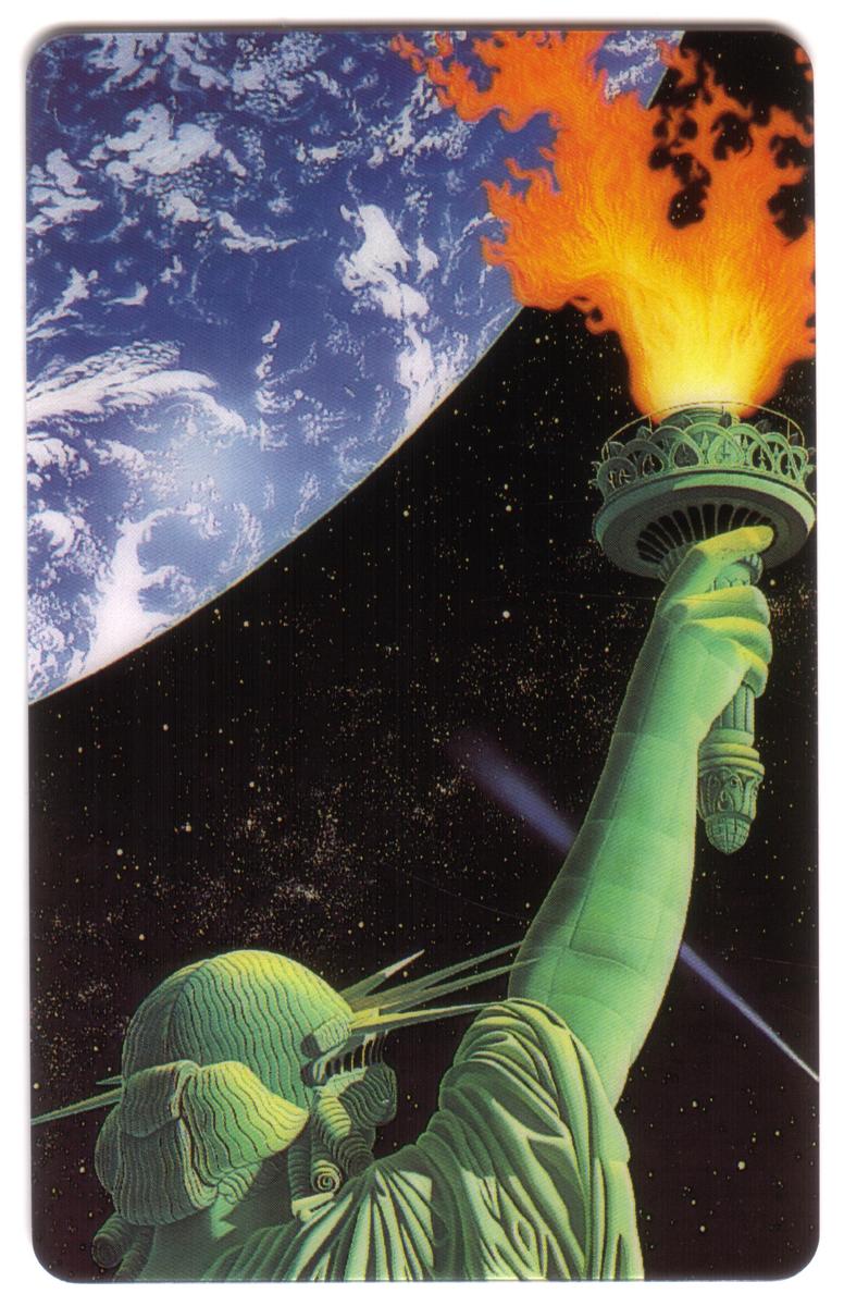 Above and to the left of the torch, Earth is shown from orbit, with cloud formations and visible landmasses set against a blue and white background. The curvature of the planet is clearly visible, offering a striking juxtaposition between the iconic American monument and the vastness of space. The statue’s head and raised arm holding the torch dominate the lower right section of the card.
