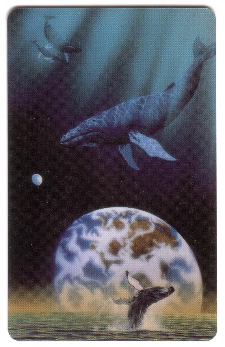 This collectible card features artwork titled "Whale Song" by the artist Schimmel. The image showcases a painting of two whales depicted in an underwater marine setting. The whales are rendered with detailed brushwork and shading, emphasizing their natural forms as marine mammals within the wild aquatic environment. The overall color palette consists of deep blues and soft whites, suggesting the whales are beneath the ocean’s surface.