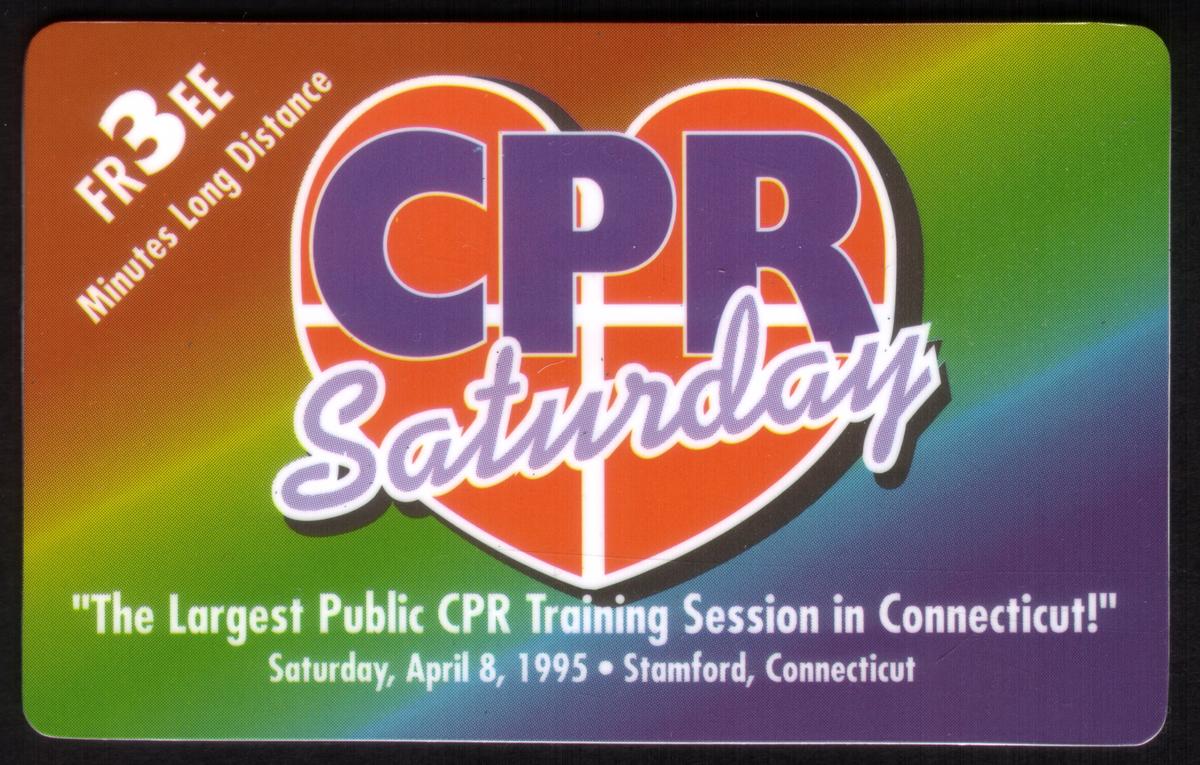 The card includes text prominently printed along the top and lower edges. The upper text reads "WELLMED INC & SCENARIO" in bold, uppercase letters, referencing the organizations involved. Near the bottom, the words “CARDIO-PULMONARY RESUSCITATION” and “3M CPR SATURDAY CONNECTICUT'S PUBLIC CPR TRAINING APRIL, 1995” highlight a specific event focused on public CPR education held in Connecticut in April 1995. This text underscores the card’s purpose as a promotional piece tied to Cardiopulmonary Resuscitation (CPR) training and awareness.