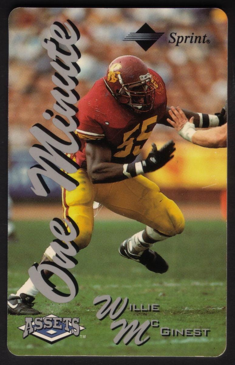 This collectible card features professional football player Willie McGinest, depicted in his NFL uniform during the 1995 season. The card is part of the 1 Minute Assets Series #2 produced by The Score Board Inc., dated March 31, 1996. Willie McGinest is shown in action, showcasing his football gear including helmet and pads associated with his role in the National Football League (NFL).