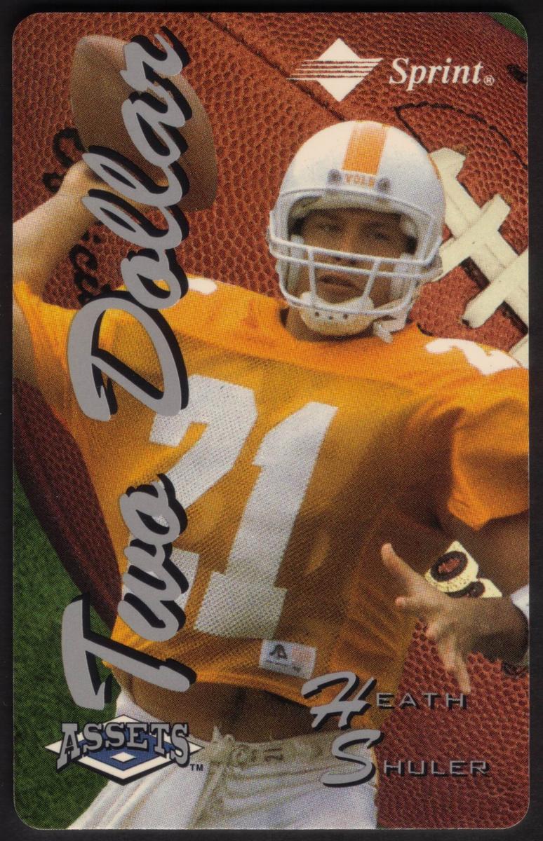The card’s visual presentation includes vibrant colors highlighting Shuler and his uniform, with additional graphic elements accentuating the sporting theme. The single focus remains on Heath Shuler in his football attire, making it a valuable collectible piece for NFL fans and sports card collectors interested in players from the mid-1990s era.