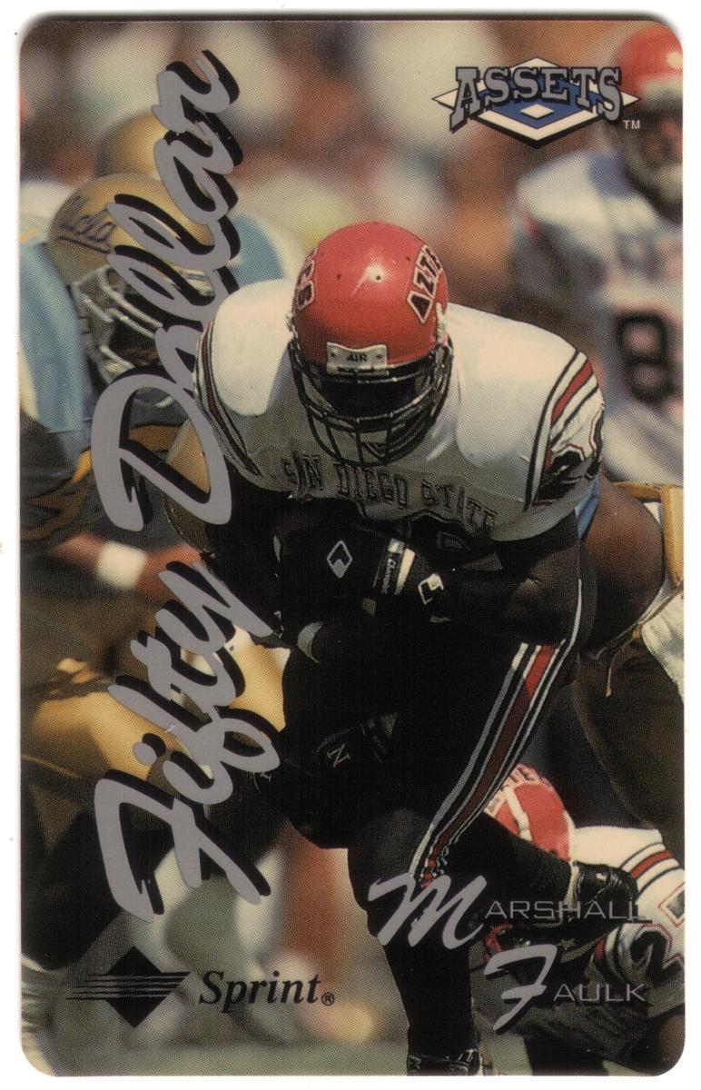 This collectible phone card features an action photograph of Marshall Faulk, a football player from San Diego State University. Faulk is captured mid-play, wearing his team’s uniform which includes a white jersey with "San Diego State" on the chest and a red helmet marked with the Aztec logo. The image conveys intensity and motion as Faulk carries the football during a game, pursued by opposing players in blue and gold uniforms.