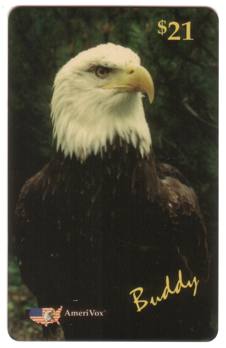 The card includes clear text that identifies the subject as "'Buddy' The Bald Eagle" and is branded with "AmeriVox." The word "wildlife" appears in the design, highlighting the natural theme focused on American bald eagles. The overall color palette centers around earthy tones and the eagle’s striking white and brown feathers.