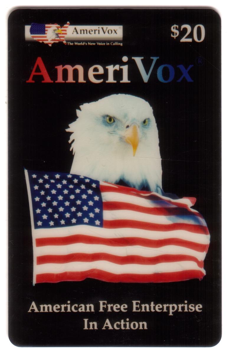 Text elements on the card include "$20" in the top right corner, indicating the card’s value. Beneath this, the title "American Free Enterprise In Action" is printed, emphasizing themes related to the American economic system. The word "USED" appears near the value, signifying the card's status. The name "AmeriVox" is also present, identifying the issuer or producer of this collectible item.