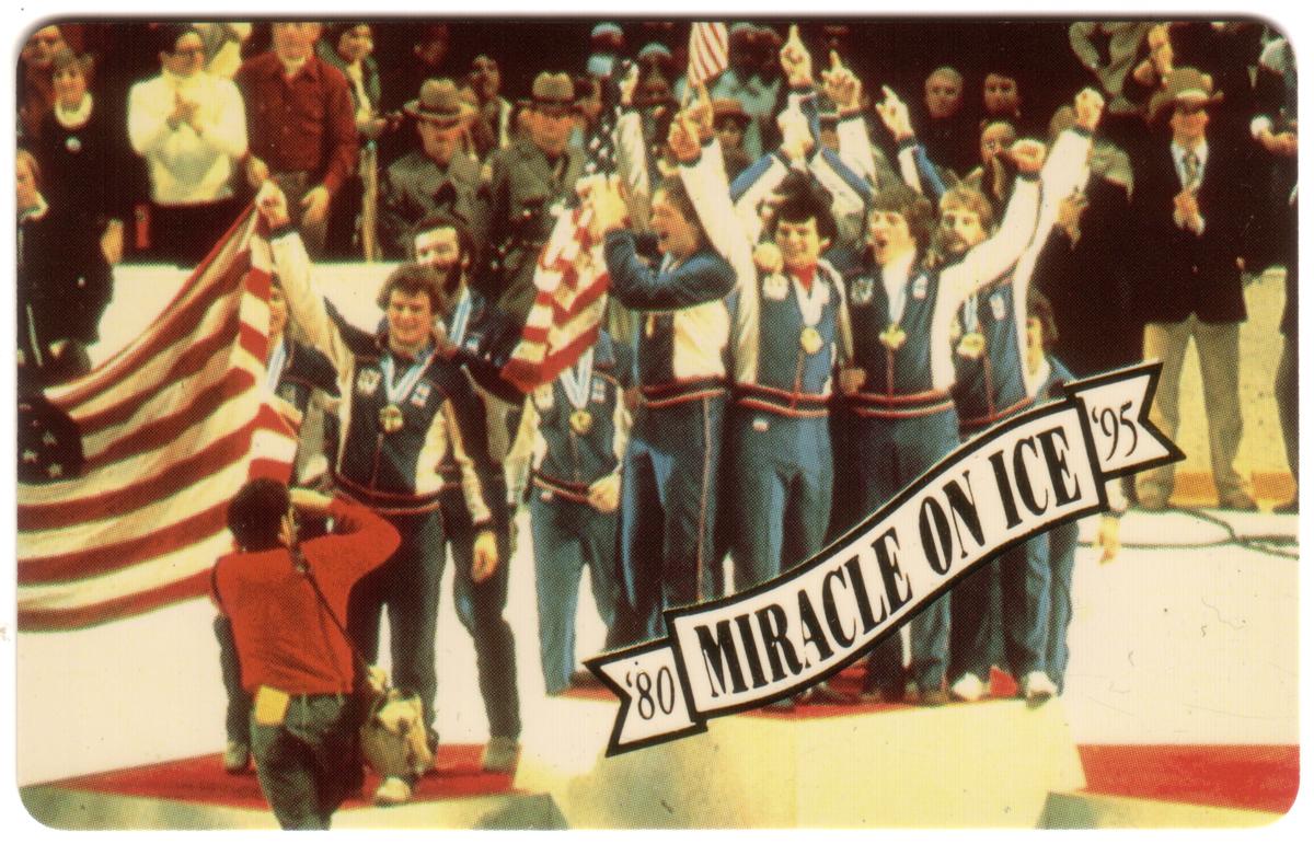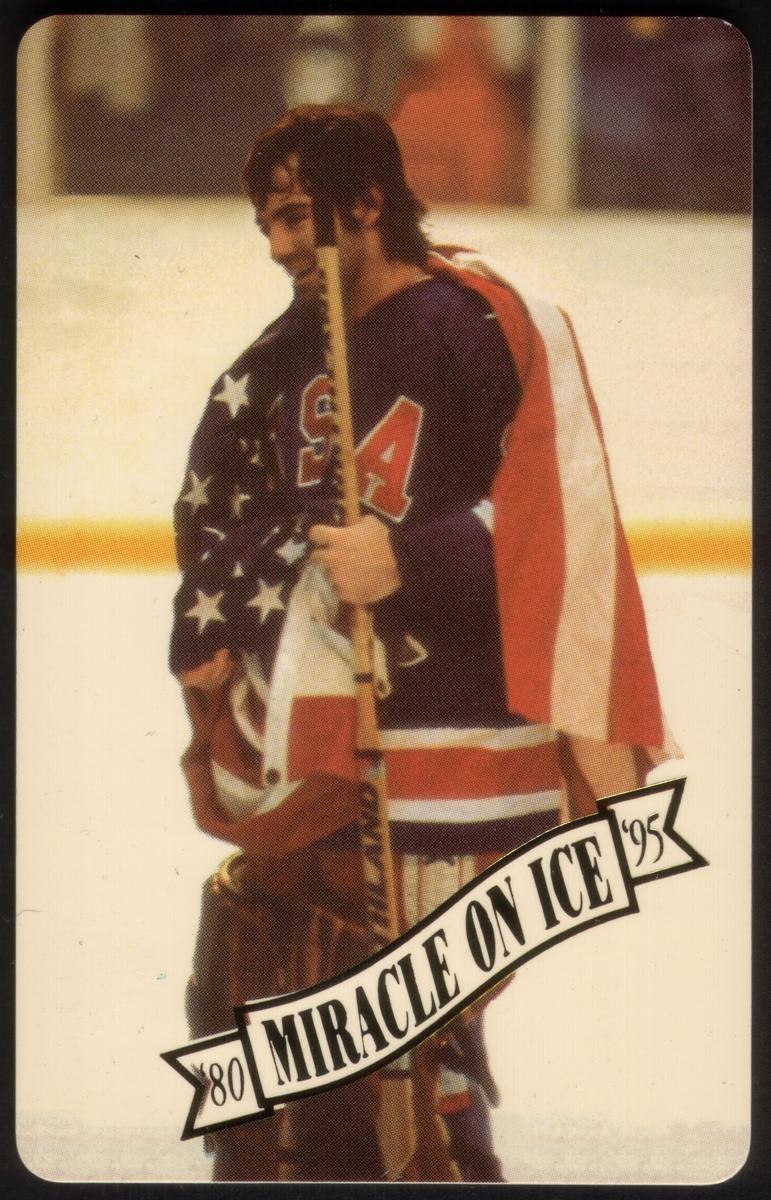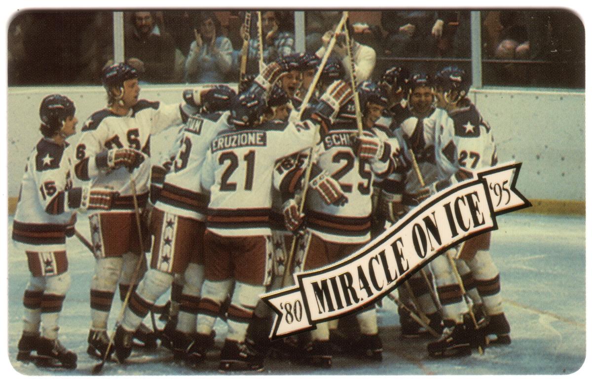 These collectible phone cards commemorate the 15th anniversary of the “Miracle on Ice,” the historic 1980 Olympic hockey victory. Each card features a vivid photographic scene related to the United States men’s ice hockey team. The players wear blue jerseys with white stars on the shoulders, red and white stripes on the sleeves and socks, and helmets. The design includes a prominent banner on the lower right corner with the text “‘80 MIRACLE ON ICE ’95.”