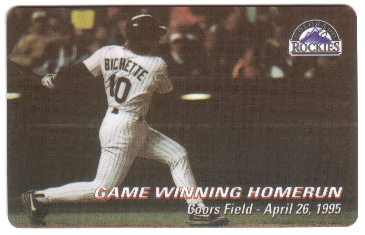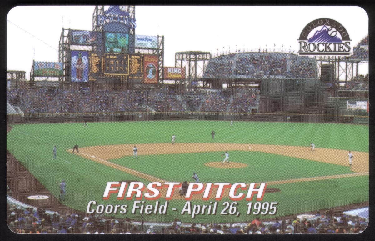 This collectible set features three phone cards celebrating significant moments and themes associated with Coors Field, the home stadium of the Colorado Rockies Major League Baseball team. Each card highlights iconic baseball imagery centered around Coors Field, with clear references to key baseball events such as the first pitch and game-winning homerun at Coors Field on April 26, 1996, which marked Opening Day for the Colorado Rockies. The cards portray dynamic baseball scenes including pitchers in action, baseballs in midflight, and the overall atmosphere of Major League Baseball gameplay.