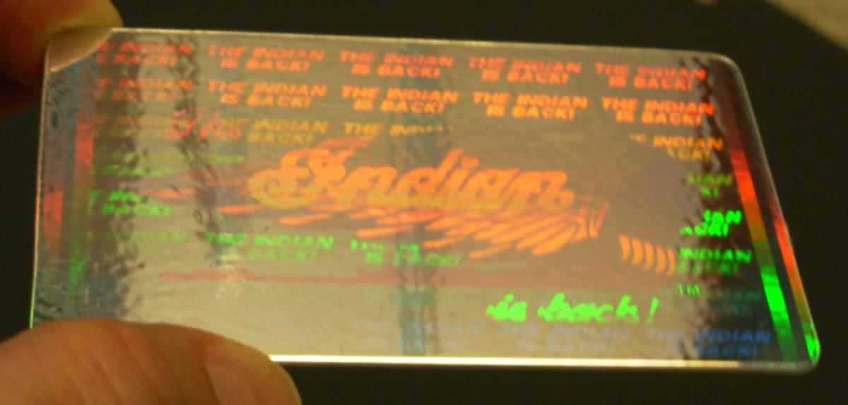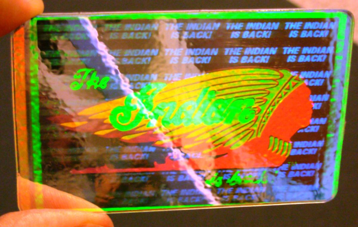 The background of the card consists of horizontal dark blue and black stripes that emphasize the holographic image and add depth to the overall design. The card’s visual focus is on the Indian Motorcycle emblem, capturing the brand’s heritage and connection to Native American imagery.