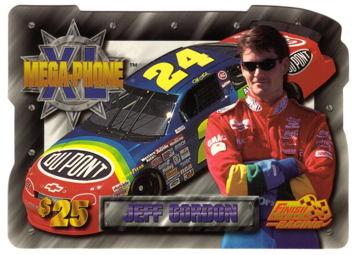 Together, these four $25 XL Mega-Phone die-cut jumbo cards create a visual tribute to these NASCAR drivers and their well-known race cars, reflecting corporate sponsorships and the excitement of professional auto racing.