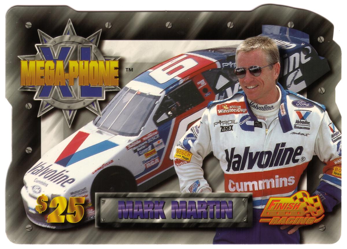 The third card depicts Mark Martin smiling while dressed in a white racing suit detailed with "Valvoline" and "Cummins" logos among other sponsor decals. He poses next to a predominantly white Ford race car, which incorporates the Valvoline "V" emblem across the hood along with the number 6 in red on the roof.