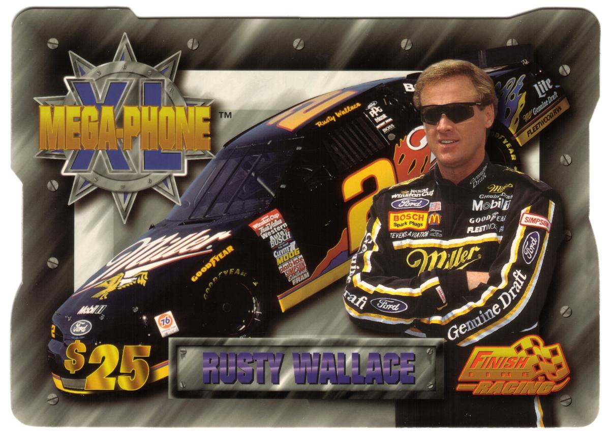 This set of four collectible phone cards features prominent NASCAR drivers alongside their race cars, each card marked with a $25 value and the "XL Mega-Phone" logo at the top left. The cards highlight the competition theme with the "Finish Line Racing" logo prominently displayed in the lower right corner. Each card features a framed nameplate displaying the respective driver’s name in bold purple letters on a metallic silver background.