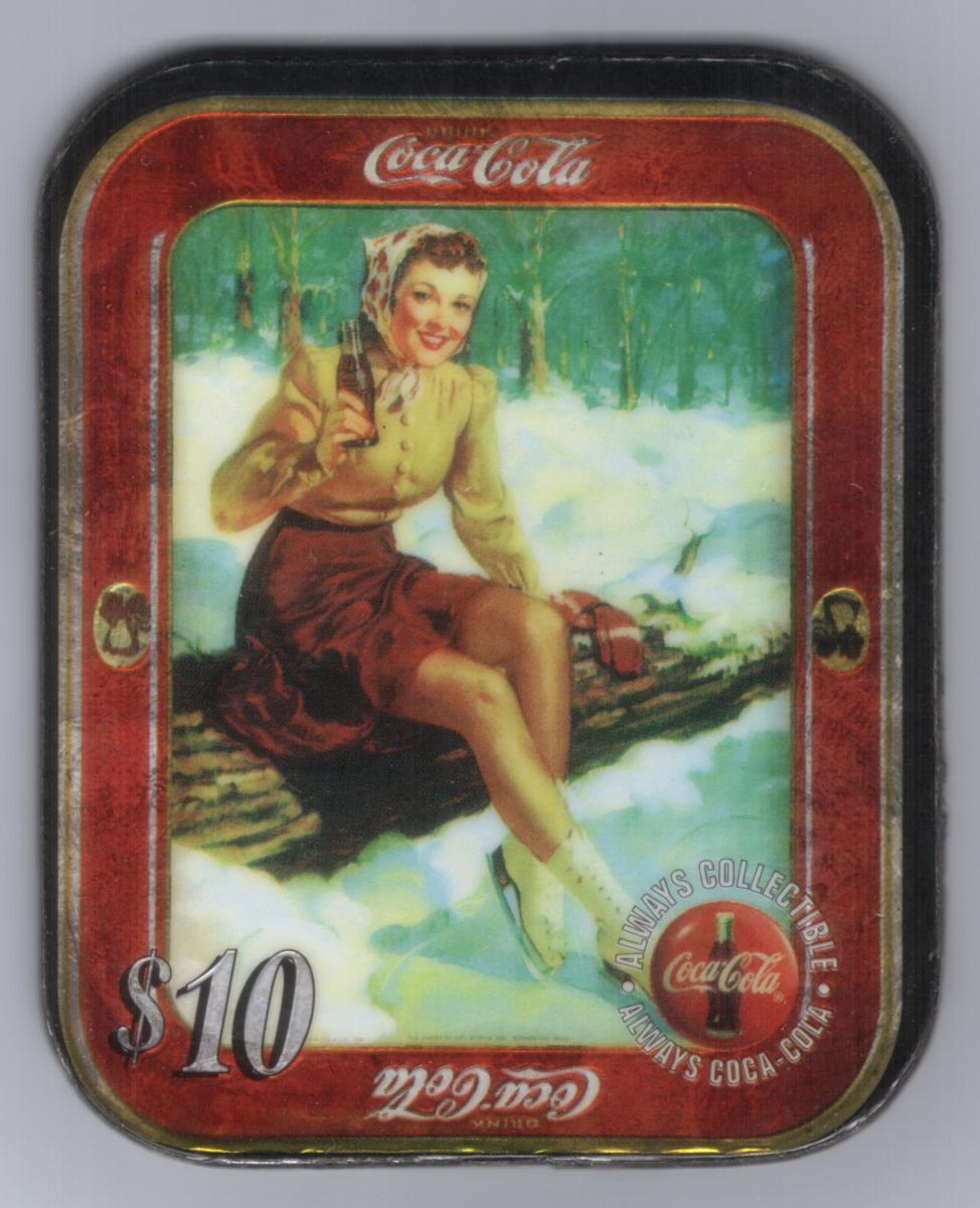 The card’s border is primarily red with distressed or aged effects, and it features two small circular Coca-Cola emblems on the sides. At the top and bottom edges is the Coca-Cola script logo in white. The value denomination "$10" is displayed in the lower-left corner in a bold silver font. Toward the lower right, there is a round emblem that reads "Always Collectible - Always Coca-Cola" surrounding a stylized red Coca-Cola bottle cap icon.
