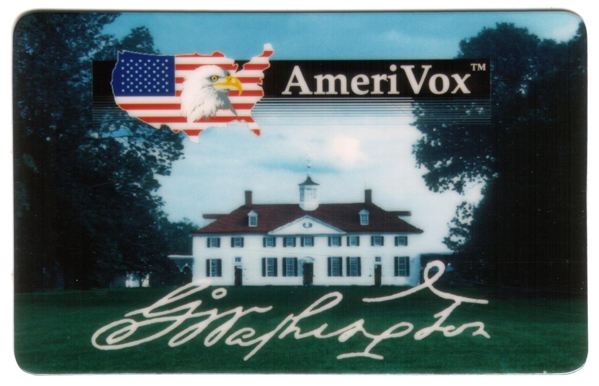 Above the mansion, the card displays the AmeriVox logo alongside a graphic of the United States map filled with the American flag pattern and superimposed with a bald eagle head. Below the mansion, there is a white facsimile signature of George Washington in cursive script.
