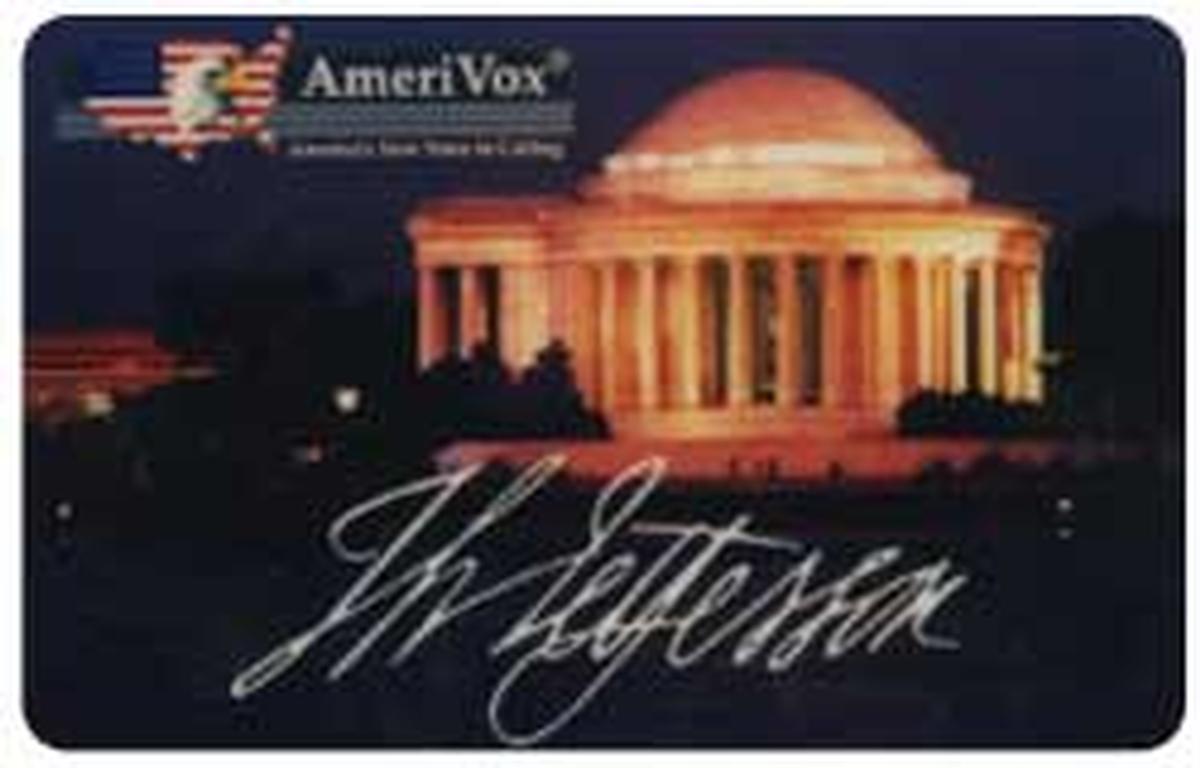 This collectible phone card features a nighttime photograph of the Jefferson Memorial in Washington, DC. The image shows the illuminated white marble structure set against a dark sky, emphasizing its classical American architectural design. The memorial’s columns and dome are clearly visible, highlighting the monument dedicated to Thomas Jefferson, the third President of the United States and principal author of the Declaration of Independence.