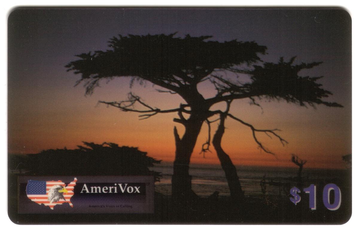 In the foreground, several plants and smaller trees are visible, adding depth and texture to the scene. The composition captures the peaceful ambiance of nature during sunset, emphasizing the tall, slender form of the cypress tree. The card’s design incorporates the text “$10,” denoting its value, alongside “Cypress Tree At Sunset” and “AmeriVox,” which identifies the issuing entity. The text is placed clearly on the right side of the card, maintaining easy readability without detracting from the artwork.