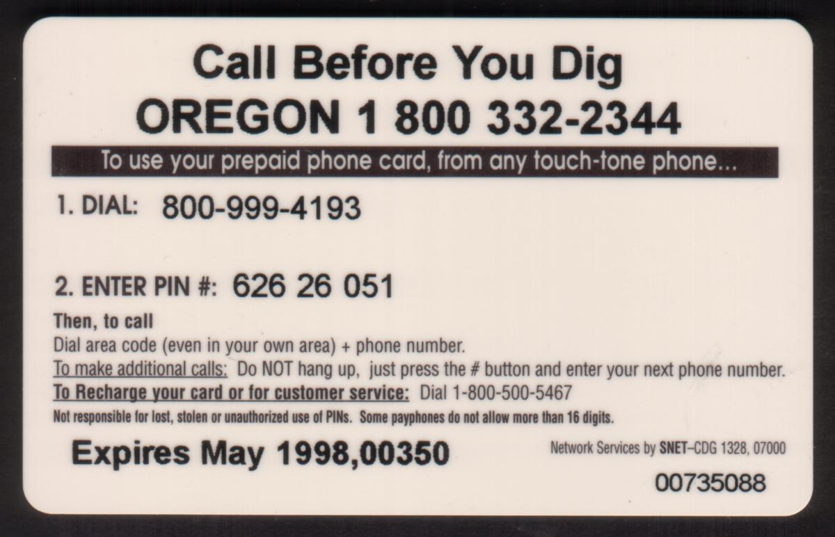 Centered beneath the logos, the card reads "Prepaid Calling Card" in black text, followed by "10 U.S. Minutes" in blue text at the bottom, indicating the prepaid value and usage limit of this phone card. The design emphasizes the "Call Before You Dig" safety message alongside AT&T’s branding, specifically for use in Oregon, linked to communications and utility safety awareness.