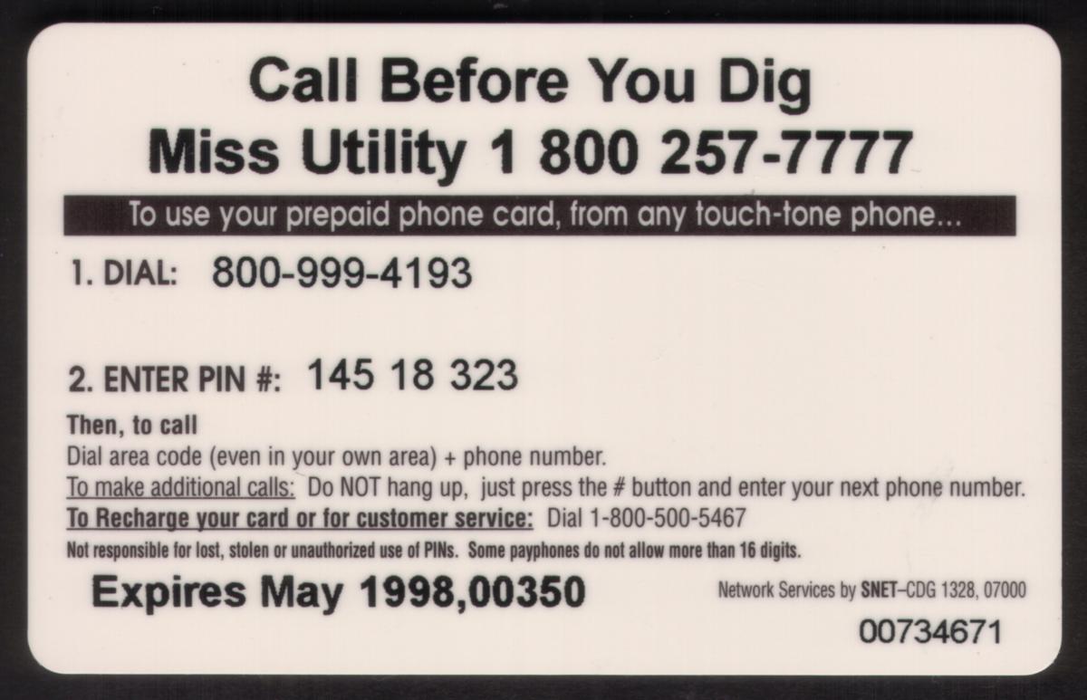 This phone card is a promotional item linked to the "Call Before You Dig" safety campaign, emphasizing safe excavation practices for underground utilities. It is associated with Mississippi utility communications and features a large AT&T design intended for general public awareness.