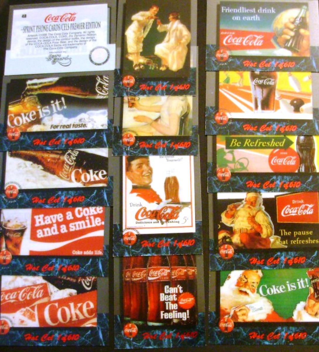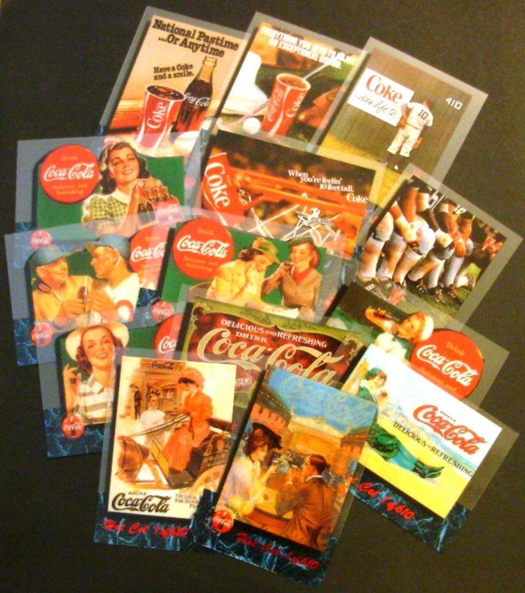 The card is part of the 1995 Coca-Cola Hot Cel Cards complete set, comprising 48 different acetate cels produced by The Score Board Inc. The front presents colorful Coca-Cola advertisements that reflect vintage and contemporary marketing styles. The overall artwork uses bright reds and whites consistent with Coca-Cola’s signature color scheme, emphasizing the classic Americana feel associated with the brand.