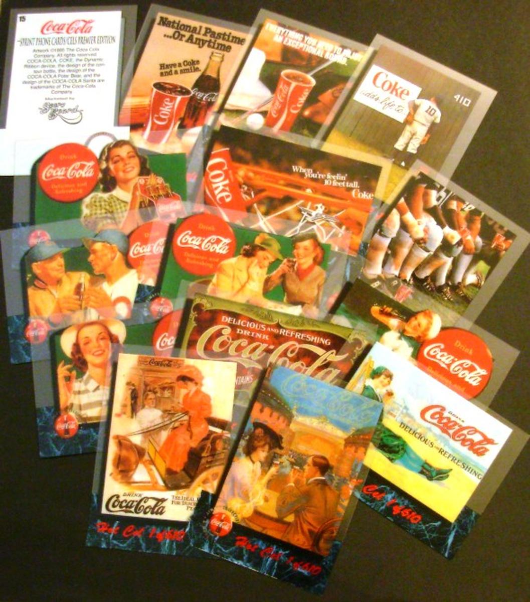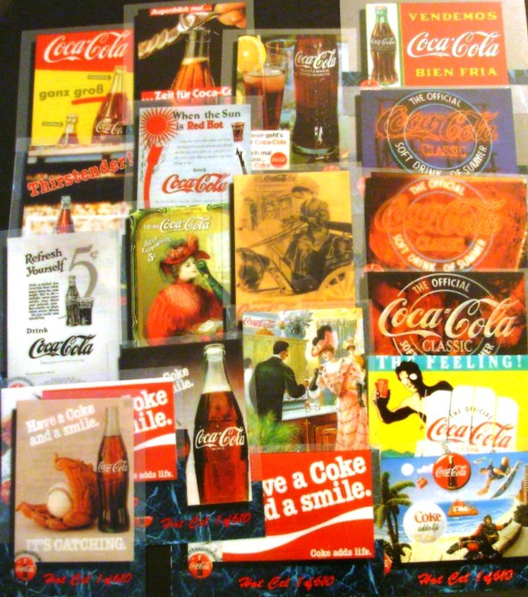 This collectible features a vibrant image centered around Coca-Cola branding and memorabilia. The design includes multiple Coca-Cola and Coke logos prominently displayed, showcasing the iconic cursive Coca-Cola script alongside other stylized Coke logos. The card highlights classic Coke bottles, both the contour glass bottle and other variations, reinforcing the brand’s recognizable packaging.